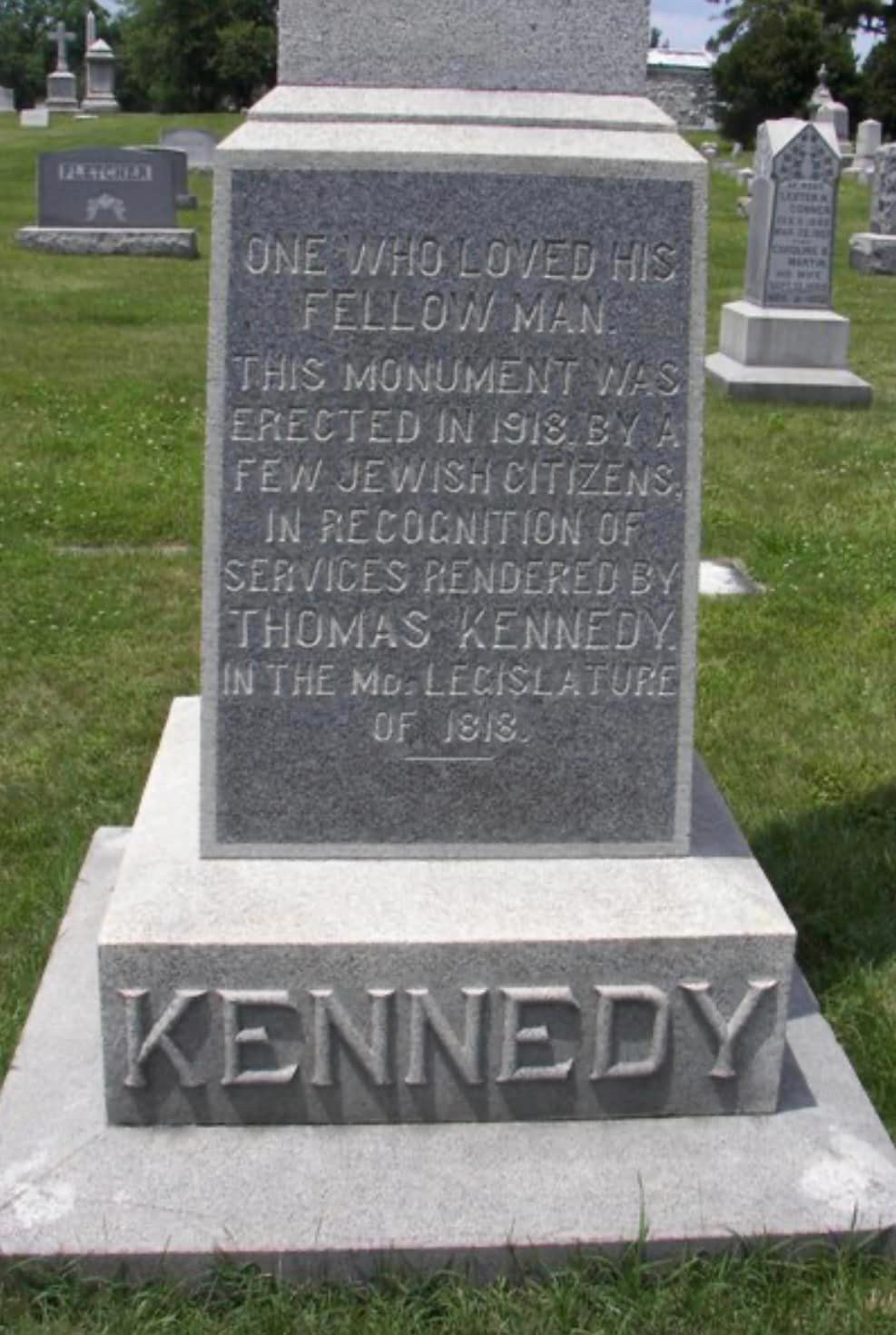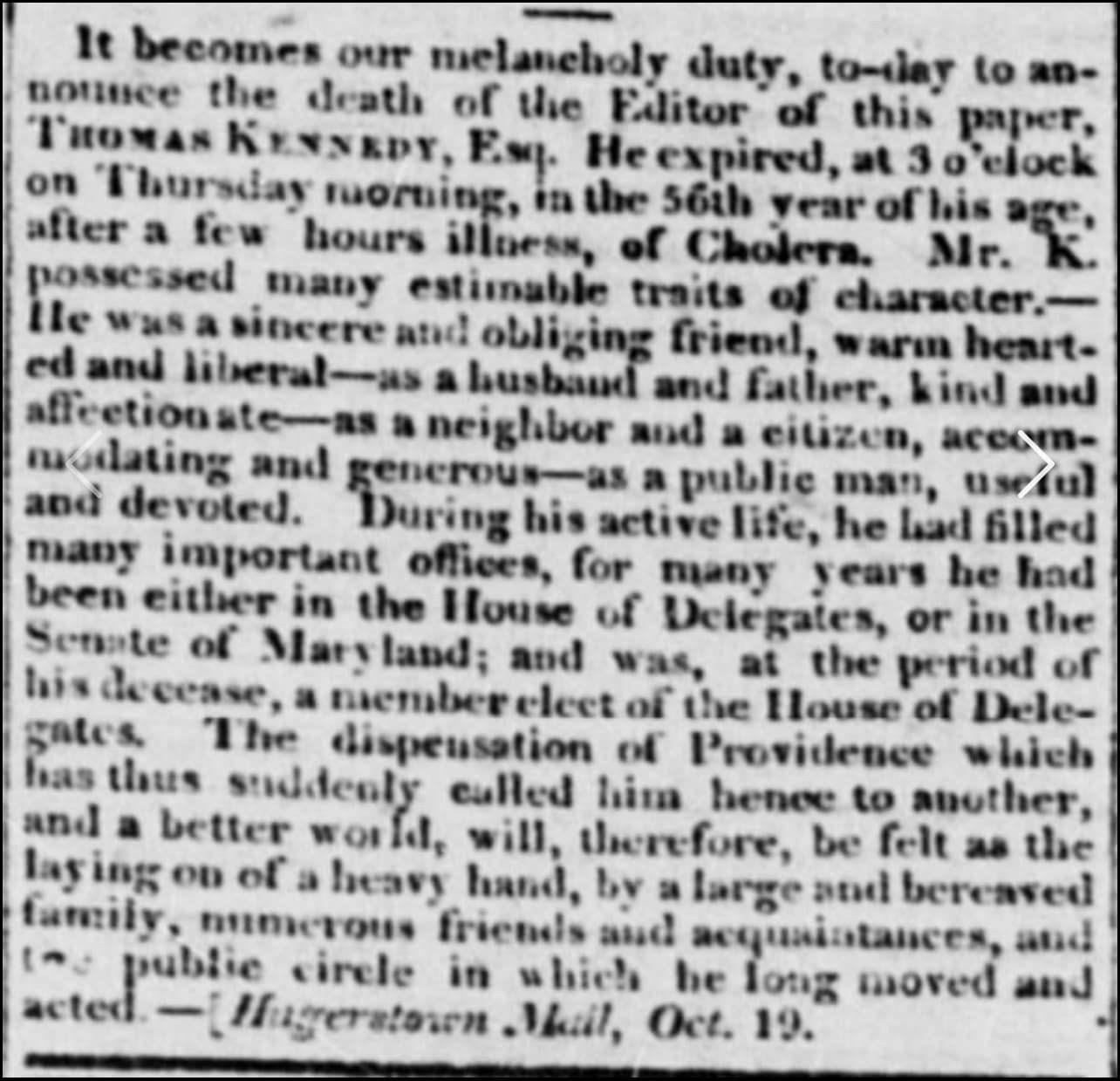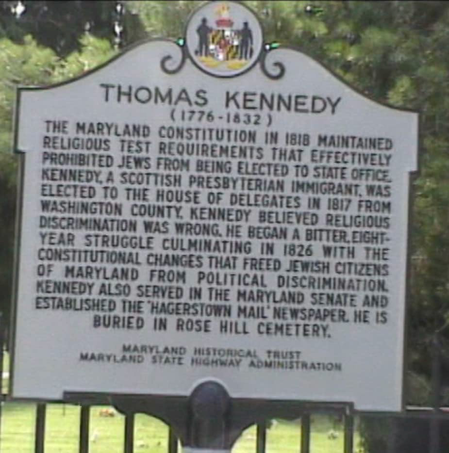 Probably due to the biased propaganda published about him during the election in the Torch Light and Herald newspapers of Hagerstown, in 1828, Kennedy became the editor of the Hagerstown Mail newspaper. He also served in the Maryland Senate and House until 1831. When a cholera epidemic swept through the country in 1832, many died, including 56-year-old Thomas Kennedy. He and Rosamond rest in Rose Hill Cemetery, Hagerstown. His obituary is a testimony that Kennedy was a kind, caring man, beloved by his community and revered by his colleagues. To this day, Thomas Kennedy is considered a champion of human rights. Acclaimed sculptor Toby Mendez designed and installed his likeness in bronze at the Thomas Kennedy Park in 2017 in downtown Hagerstown.