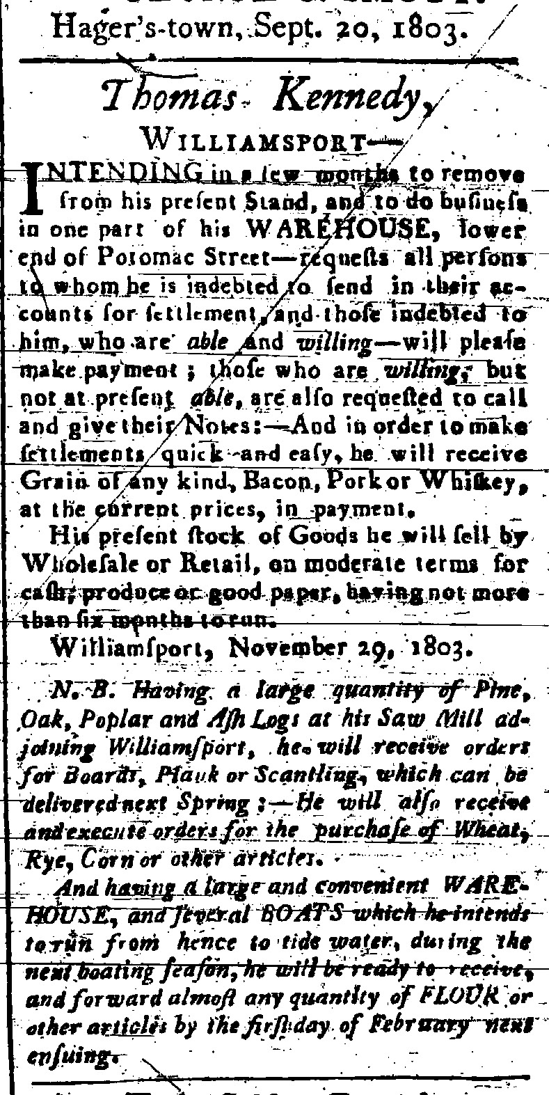 In 1807, William Compton foreclosed and offered all three parcels of the Kennedy real estate in Williamsport at auction. Apologizing for his situation, Kennedy gave notice in the Federal Gazette newspaper of Baltimore that after ten years of industry in Williams-Port, he was quitting his business and vowed to settle every claim someday. Kennedy and his family left Williamsport and moved first to Woburn Manor, then Ellerslie, later Hagerstown, where he lived until his death in 1832.