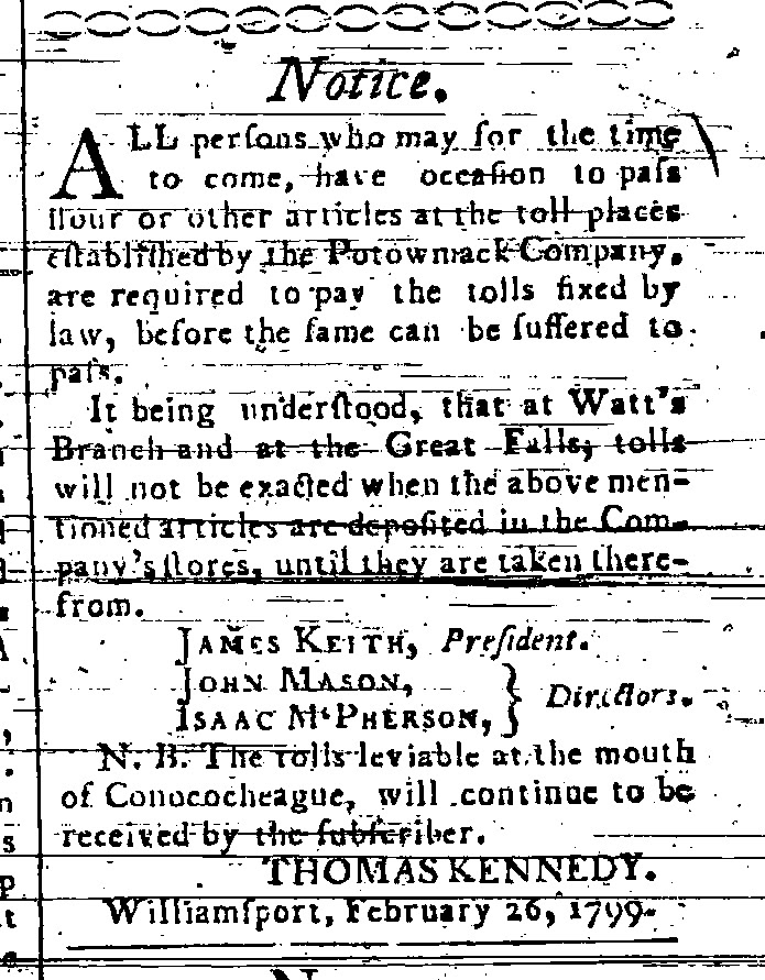 Thomas Kennedy was born in 1776 in Paisley, Renfrewshire, Scotland. He immigrated to the United States in 1795, settling in Virginia at Great Falls in a now-extinct town called Matildaville. Just across the river in Georgetown, he was employed as an agent for the Potomac Company. By February of 1798, Kennedy was the agent toll collector for the Potomac Company at Williams-Port, and a partner in the commodities firm of John Kennedy & Company, assumed to be his brother. Two years later, the brothers dissolved their partnership, and Kennedy opened a mercantile in a brick house on the Williams-Port public square. In 1802, Kennedy married Rosamond Thomas from Frederick and signed a lease for mill land on the Conococheague.