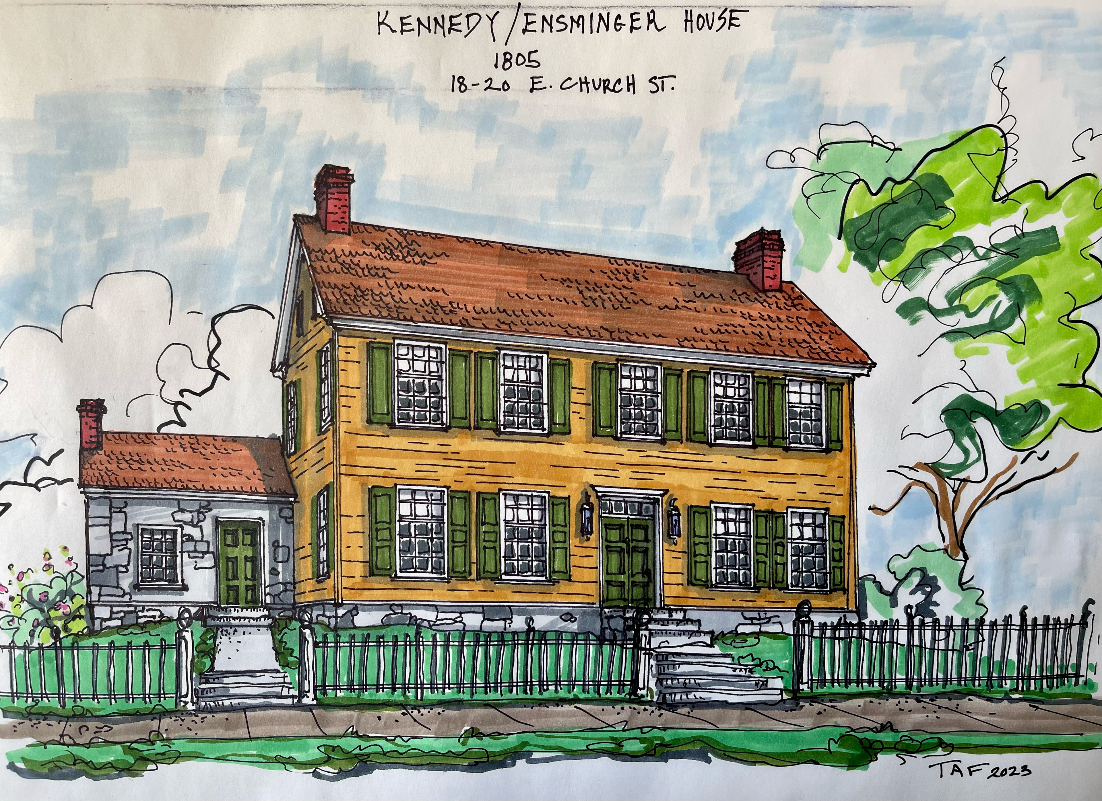By 1803, Kennedy had closed his retail store and worked exclusively from his large warehouse on W Potomac Street, lot 223, the original warehouse built by Elie and Otho Holland Williams shortly after the town's founding. From his warehouse known as "The Washington Warehouse," Kennedy purchased or consigned grain, flour, bacon, pork, and whiskey cargoes for transport by his several boats making frequent trips to Georgetown. Additionally, Kennedy stockpiled and sold quantities of pine, oak, poplar, and ash from his sawmill on the Conococheague. A confident merchant and now a family man, Kennedy built his family a fine, large homestead on his three Church Street lots. He also leased lot 134 on W. Frederick Street, where he began constructing a modest house, likely for resale. Today that house still stands at 35 W. Frederick Street.