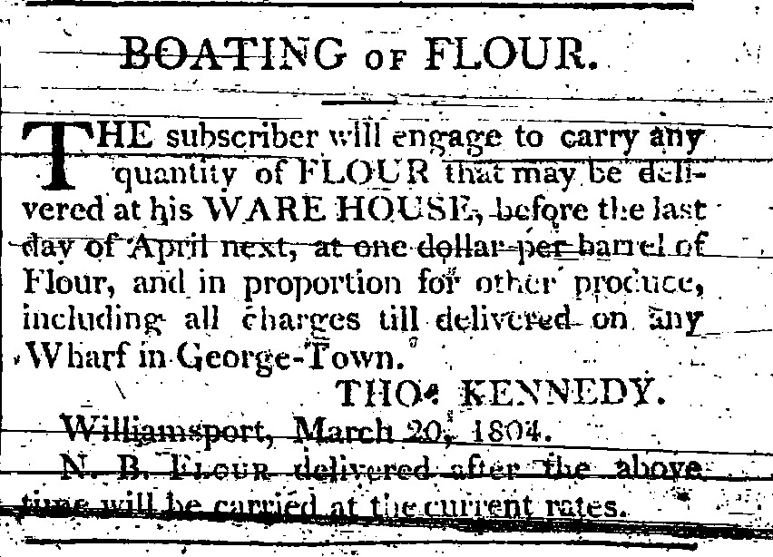 It is not clear how or why Kennedy's businesses in Williamsport failed. His politely worded notices in the newspaper asking those indebted to him to "please make payment" if they were "able and willing" suggests Kennedy may have been too lenient with others in his financial transactions. In 1805 Kennedy mortgaged his three home lots (158-159-160), the warehouse lot (223), and the unfinished house on W. Frederick Street (134) for the considerable sum of 601£ to William Compton to help settle debts to relatives Joseph and Adiranna Kennedy. Compton gave Kennedy two years to repay the mortgage.